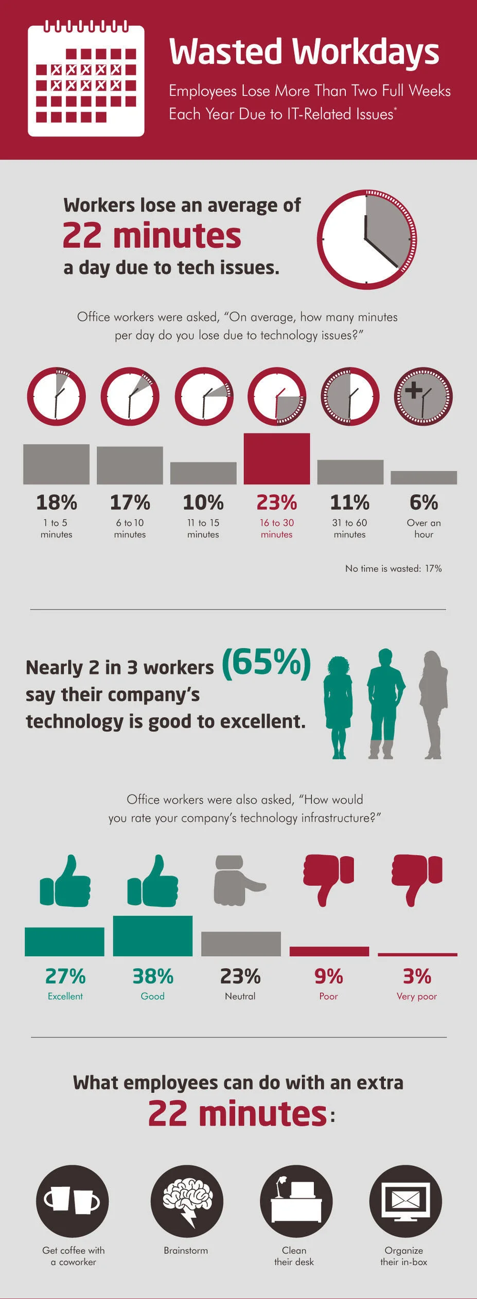A survey shows that the average professional worker loses 22 minutes each day on IT-related problems, with 40% of professionals wasting between 16 and 60 minutes per day.